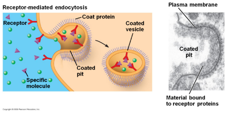受体介导的胞吞作用示意图,蓝色区域为胞外,橘色区域为胞内,红色为细胞膜表面受体