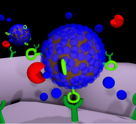 纳米颗粒模型示意图。核心为氧化铁(棕色),外面包被有多肽(蓝色),连接有肿瘤穿透性肽(绿色),当纳米颗粒遇到蛋白酶(红色)时,多肽被切割