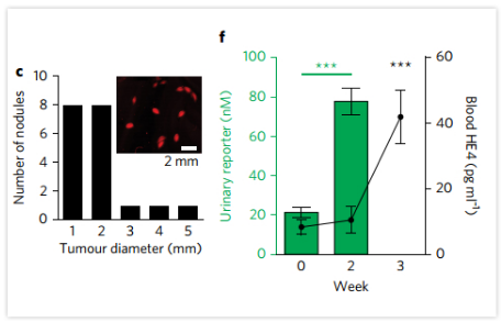 图 f:纳米颗粒组(绿色)小鼠从尿液测试中已经检测到了肿瘤的存在