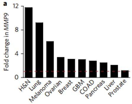 MMP9 在不同癌变组织中的表达,依次为头颈癌、肺癌、黑色素瘤、卵巢癌、乳腺癌、胶质母细胞瘤、结直肠癌、胰腺癌、肝癌和前列腺癌